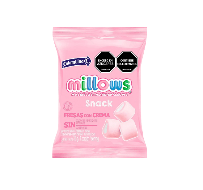Los Masmelos Millows Fresa con Crema de 35 gramos son suaves y esponjosos, con un delicioso sabor a fresa combinado con un toque cremoso que hace cada bocado irresistible. Su presentación colorida y llamativa los convierte en un snack ideal para compartir, decorar postres o disfrutar en cualquier momento del día. Con su textura ligera y su dulzura equilibrada, los Masmelos Millows Fresa con Crema ofrecen diversión y sabor para niños y adultos por igual.