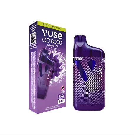 Vape Vuse Go Grape Ice de 8000 puff y 34 mg/ml, con un sabor refrescante a uva helada y alto rendimiento en un dispositivo desechable.